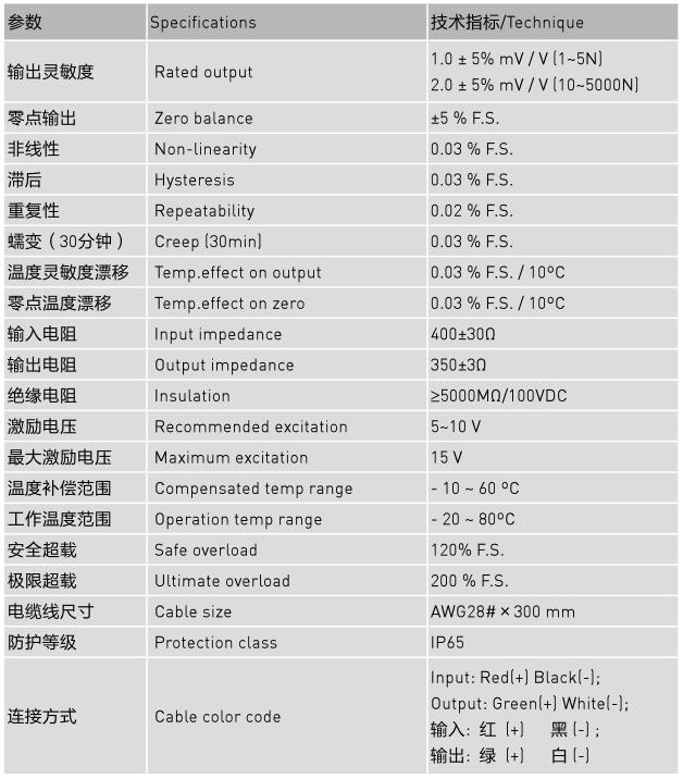 鋁合金或合金鋼材料,采用金屬箔式應(yīng)變片技術(shù),帶過載保護(hù)。